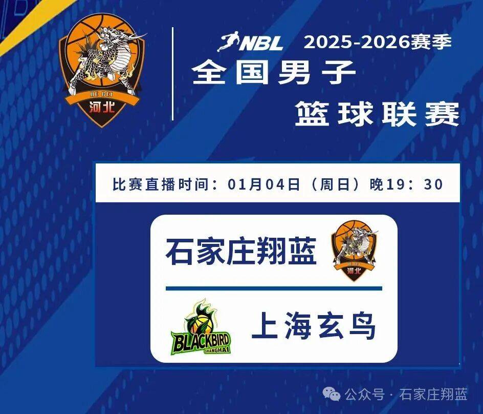 对阵双方:石家庄翔蓝VS上海玄鸟 2026年1月4日,石家庄翔蓝将迎来2026年的首个主场比赛,在本赛季NBL联赛第六轮比赛中,主场迎战上海玄鸟。 前五轮比赛,石家庄翔蓝与上海玄鸟均取得了四胜一负,占据排行榜前列。这场比赛的结果,很有可能对双方的最终排名产生直接影 响,因此堪称卡位之战。翔蓝将力争守卫主场,期待与广大球迷相会河北体育馆。 比赛时间:2026年1月4日(周日)19点30分 比赛地点:河北体育馆 直播平台:抖音、微信视频号、今日直播 来源:石家庄翔蓝 主办:石家庄市体育局 石家庄市体育总会 ...