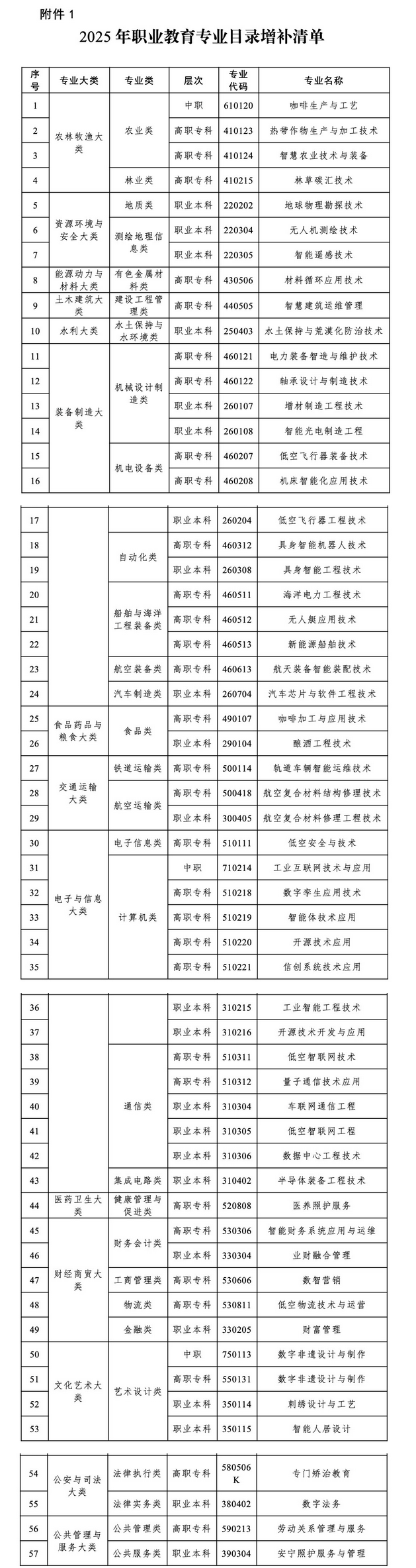 近日,教育部对2026年职业教育拟招生专业设置管理工作进行安排,并公布《2025年职业教育专业目录 增补清单》,共包含57个职业教育专业。其中,中职专业3个、高职专科专业31个、职业本科专业23 个。 根据管理工作安排,各省级教育行政部门要加强专业设置统筹管理,健全专业设置调整机制,推动专业 设置快速响应人才需求。组织"双高建设计划"学校和其他有条件的职业学校,围绕本地区重点产业、特 色产业发展需求,实施高技能人才集群培养计划。 各地、各职业学校要严格按照中职、高职专科、职业本科专业设置管理办法及有关要求,依据《职业教 育专业目录》和2025年职业教育专业目录增补清单,开展拟招生专业设置管理工作。 新京报记者了解到,依据《国家职业教育改革实施方案》要求,原则上每5年修订1次职业院校专业目 录,学校依据目录灵活自主设置专业,每年调整1次专业。2025年7月,教育部职成司发布《关于组织开 展2025年职业教育专业目录增补专业论证工作的通知》,旨在围绕国家战略和区域、行业高质量发展新 需求,促进专业设置与区域产业布局紧密对接。 | 17 | | | 职业本科 | 260204 | 低空飞行器工程技术 | | --- ...