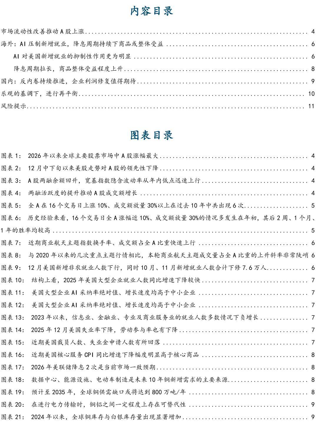 Group 1: Market Liquidity and A-Share Performance - The improvement in market liquidity has been a direct catalyst for the recent rise in A-shares, with margin trading balances increasing by over 125 billion yuan in just half a month, leading to a more than 35% increase in trading volume across the A-share market [3][13][22] - Historical data shows that similar situations, where the A-share market rose by nearly 10% over 16 trading days with trading volume expanding by over 30%, have occurred six times in the past decade, predominantly at the beginning of the year [3][18][22] - The recent surge in the commercial aerospace index has led to a significant increase in turnover rates and trading volume proportions, indicating a potential structural overheating in the market [3][22] Group 2: AI Impact on Employment and Economic Policy - The U.S. job market continues to face pressure, with December's non-farm payrolls adding only 50,000 jobs, below expectations, and a downward revision of 76,000 jobs for October and November [4][26][33] - The adoption of AI by large U.S. companies has significantly suppressed employment growth, particularly in the information, finance, and professional services sectors, which have collectively lost 344,000 jobs over the past three years [4][26][33] - The Federal Reserve's extended rate-cutting cycle is expected to benefit commodity markets, as inflation concerns related to AI investments are easing [4][40][41] Group 3: Domestic Economic Recovery and Policy Optimization - The Producer Price Index (PPI) for industrial enterprises in December showed a year-on-year increase, indicating a shift from price drag to price support for corporate revenues [5][56] - The Consumer Price Index (CPI) has also risen, with the core CPI maintaining its highest level in five years, reflecting a smoother transmission of prices from enterprises to consumers [5][56] - The ongoing anti-involution policies are expected to enhance corporate profitability, with regulatory measures aimed at preventing monopolistic practices and promoting fair competition [5][62] Group 4: Rebalancing and Investment Recommendations - The report suggests a positive outlook for A-shares, driven by improved liquidity and favorable domestic and international economic conditions [6][63] - Recommended investment areas include industrial resource products like copper, aluminum, and lithium, as well as sectors benefiting from the recovery of domestic manufacturing and consumer spending [6][63] - The report emphasizes the importance of capturing opportunities in sectors such as aviation, duty-free, and food and beverage, which are expected to benefit from increased consumer income and tourism recovery [6][63]