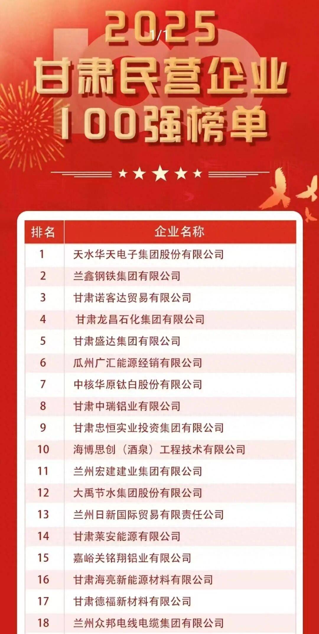 9月29日,甘肃省工商联发布2025甘肃民营企业100强榜单,中核华原钛白股份有限公司、甘肃中瑞铝业有限公司、甘肃忠恒实业投资集团有限公司、甘肃 东方钛业有限公司、靖远高能环境新材料技术有限公司、白银中天新材料有限责任公司、甘肃品高食品有限公司、甘肃新基工程建设有限公司等白银市8 家企业入围。其中,3家企业跻身10强,入围企业数量位居市州第3位。 此次入围的8家企业,作为白银市民营经济的标杆企业,多年来,积极响应市委、市政府号召,聚焦主业,做强实业,企业规模不断壮大,盈利能力持续 增强,为我市民营经济高质量发展注入了强劲动力。 中核华原钛白股份有限公司:作为钛白粉行业的领军型企业,素来享有中国钛白"黄埔军校"的美誉。公司于2007年8月在深圳证券交易所上市,主营产品 钛白粉作为"白色颜料之王",被广泛应用于涂料、塑料、油墨、造纸等行业。位居榜单第7位。 甘肃中瑞铝业有限公司:铝产业链项目是甘肃省"十二五"规划重点招商引资项目和五个千亿级产业重点企业项目之一。2021年4月由杭州锦江集团全面投 资建设,建成后预计年产值达274.13亿元,将成为全国绿色铝产业标杆企业。位居榜单第8位。 甘肃忠恒实业投资集团有限公 ...