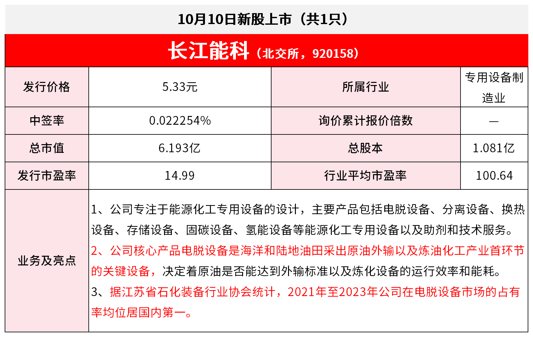 *风险提示:股市有风险,入市需谨慎 *免责声明:文章内容仅供参考,不构成投资建议 | | PS ( = [ ] ( \ ( \ | | | --- | --- | --- | | 发行价格 | 5.33元 | | | 智签署 | 0.022254% | 询价 | | 总市值 | 6.193亿 | | | 发行市盈率 | 14.99 | 行业 | | 业务及亮点 | 1、公司专注于能源化工专用设备的设计,主要产 | | | | 设备、存储设备、固碳设备、氢能设备等能源化 | | | | 2、公司核心产品电脱设备是海洋和陆地油田采出 | | | | 的关键设备,决定着原油是否能达到外输标准以, | | | | 3、据江苏省石化装备行业协会统计,2021年至2 | | | | 率均位居国内第一。 | | ...