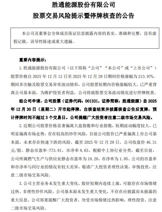 Group 1 - The core point of the article is that Victory Energy's stock price has increased by 213.97% from December 12 to December 29, 2025, which has significantly deviated from the company's fundamentals, prompting a trading suspension for verification [1] - The company announced that its stock will be suspended from trading starting December 30, 2025, for a period not exceeding three trading days [1] - Victory Energy indicated that the recent stock price has diverged significantly from both the market index and industry index, suggesting a high risk of speculation and potential for a rapid decline in stock price [1] Group 2 - Victory Energy, established in 2012, specializes in the procurement, transportation, and sales of LNG, as well as the transportation of crude oil and general cargo [3] - As of the latest closing, Victory Energy's stock price reached 46.31 yuan, with a total market capitalization of 13 billion yuan, marking the stock's 12th consecutive trading day of hitting the upper limit [3] - The company reported a significant increase in stock price despite no major changes in its core business, indicating potential irrational market behavior [1][3]