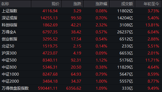 Market Overview - Major A-share indices collectively rose, with the Shanghai Composite Index increasing by 0.08%, Shenzhen Component Index by 0.70%, ChiNext Index by 0.54%, and the STAR Market 50 Index by 3.53% [1] - The total trading volume in Shanghai and Shenzhen exceeded 2.6 trillion yuan, a decrease of nearly 200 billion yuan compared to the previous day [1] Index Performance - Shanghai Composite Index: 4116.94, up 3.29 points (0.08%), with a trading volume of 1.18 trillion yuan and a year-to-date increase of 3.73% [2] - Shenzhen Component Index: 14255.13, up 99.50 points (0.70%), with a trading volume of 1.42 trillion yuan and a year-to-date increase of 5.40% [2] - ChiNext Index: 3295.52, up 17.54 points (0.54%), with a trading volume of 651.2 billion yuan and a year-to-date increase of 2.88% [2] - STAR Market 50 Index: 1862.69, up 42.21 points (2.32%), with a trading volume of 310.8 billion yuan and a year-to-date increase of 13.81% [2] Sector Performance - The majority of industry sectors saw gains, with precious metals, energy metals, mining, electrical machinery, semiconductors, small metals, and electronic components leading the increases [2] - The coal, liquor, retail, and electric grid equipment sectors experienced the largest declines [2] Stock Performance - Nearly 3000 stocks rose, with close to 90 stocks hitting the daily limit up [3] - The precious metals sector surged, with stocks like Hunan Silver, Zhaojin Gold, Sichuan Gold, and Western Gold hitting the daily limit up [3] - The semiconductor sector also saw significant gains, with stocks such as Longxin Technology, Dagan Co., Huatech, Yingfang Micro, and Tongfu Microelectronics hitting the daily limit up [3] Capital Flow - In terms of industry capital flow, semiconductor, computer equipment, and non-ferrous metals sectors ranked high in net inflows, with semiconductors seeing a net inflow of 12.07 billion yuan [6] - Conversely, the electric grid equipment, liquor, and photovoltaic equipment sectors experienced significant net outflows, with electric grid equipment seeing a net outflow of 6.095 billion yuan [6]
