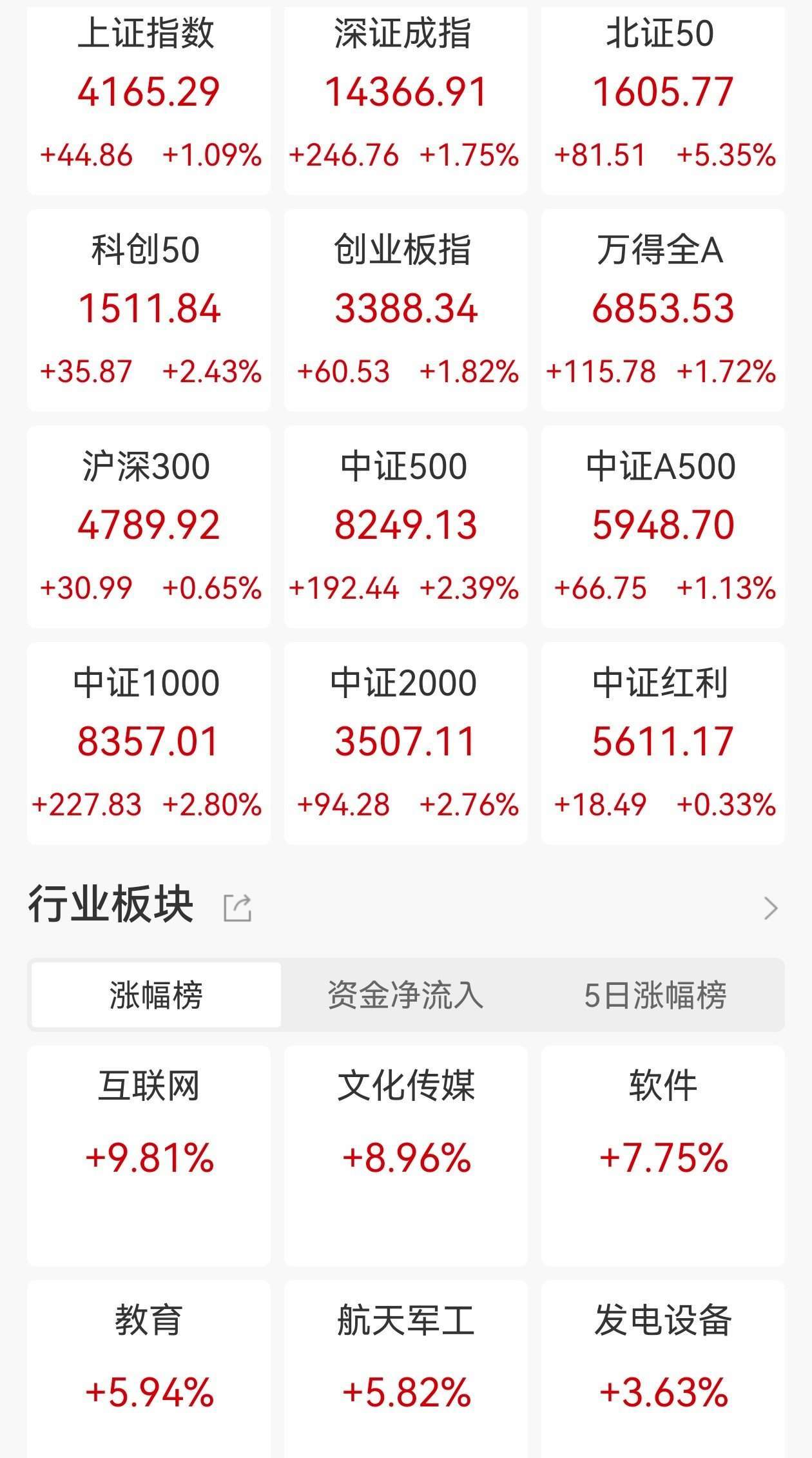 A股收评:三大指数均涨超1%,沪指17连阳北证50涨超5%,AI应用、商业航天引爆市场!超4100股上涨,成交额3.64万亿创新高放量4922亿