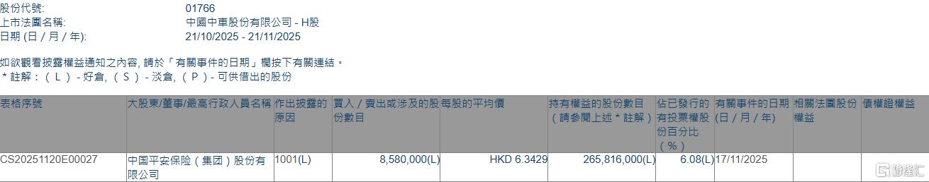 格隆汇11月21日丨根据联交所最新权益披露资料显示,2025年11月17日,中国中车(01766.HK)获中国平安保险(集团)股份有限公司在场内以每股均价 6.3429港元增持858万股,涉资约5442.21万港元。 | 表格序號 | 大股東/董事/最高行政人員名稱 作出披露的 買入 / 賣出或涉及的股每股的平均價 | | 持有權益的股份數目 佔已發行的 有關事件的日 | | | --- | --- | --- | --- | --- | | | | | (請參聞上述*註解)有技票權版(日/月/年) | | | | | | 分自分库 | | | CS20251120E00027 | 中国平安保险(集团)股份有 (1001(L) | 8,580,000(L) | HKD 6.3429 265,816,000(L) | 6.08(L)17/11/2025 | | | 限公司 | | | | 增持后,中国平安保险(集团)股份有限公司最新持股数目为265,816,000股,持股比例由5.88%上升至6.08%。 ...