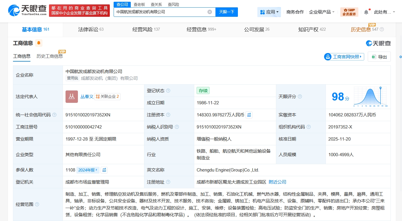 每经AI快讯,天眼查工商信息显示,近日,中国航发成都发动机有限公司发生工商变更,四川省投资集团有限责任公司退出股东行列,新增成都重产空天 动力科技有限公司、四川能源发展集团有限责任公司、国家军民融合产业投资基金二期有限责任公司为股东,注册资本由约10.4亿元人民币增至约14.8亿元 人民币,增幅约42.5%。同时,多位高管发生变更。中国航发成都发动机有限公司成立于1986年11月,法定代表人为丛春义,经营范围包括制造、加工、销 售、修理航空发动机及售后服务,公共安全设备、器材及技术开发、技术服务、技术咨询等。股东信息显示,该公司由中国航空发动机集团有限公司、成都 先进制造产业投资有限公司及上述新增股东等共同持股。 | | | | 草公司 直老板 童关系 音风险 | | | | | --- | --- | --- | --- | --- | --- | --- | | | | 都在用的商业查询工具 家中小企业发展子基金旗下机构 | 中国航发成都发动机有限公司 | | × 天眼一下 | 器 应用 ▼ | | 是本信息 161 | | 法律诉讼 63 | 经营风险 137 | 经营信息 999+ | | 公司发展 ...