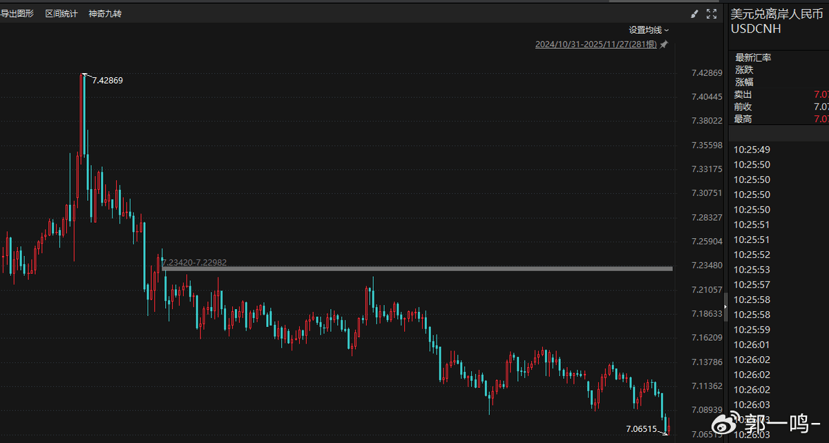 来源:郭一鸣- 1、股市震荡之际,人民币创一年新高 最近股市震荡整理,但汇率市场却悄然生变! 11月26日,美元兑离岸人民币汇率升破7.08关口,创2024年10月14日以来新高;11月27日走势再加速,离岸人民币进一步突破7.07,连续刷新一年来峰值。 与此同时,在岸人民币对美元即期汇率同步升破7.09关口,同样创下逾一年新高。 美元兑离岸人民币汇率升破7.08,创下去年10月14日以来新高。与此同时,在岸人民币对美元即期汇率也升破7.09关口,同样创下逾一年新高。今年以来, 人民币对美元汇率中间价年内涨幅约1000个基点。衡量人民币对一篮子货币的CFETS人民币汇率指数亦升至98.22,创下4月初以来的高点。 这轮人民币升值既反映了国内外经济环境的变化,也为A股市场带来了新的活力和机遇! 值得注意的是,每一次人民币的升值,往往股市就会有反应。而我们也乐于从人民币的升值中寻找和分析股市的影响和机遇。 理论上看,人民币升值通过三大渠道影响股市:其一,资本流动渠道,升值提升人民币资产相对收益,吸引外资流入;其二,企业盈利渠道,进口依赖型企 业因成本下降增厚利润,出口导向型企业则面临竞争力削弱压力;其三,政策空间 ...