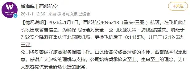 西部航空发布情况说明:PN6213航班爬升阶段出现警告信息,已返航重庆 2026年1月1日,西部航空PN6213(重庆-三亚)航班,在飞机爬升阶段出现警告信息,为确保飞行绝对 安全,公司快速决策-飞机返航重庆。航班于7:52安全降落在重庆江北国际机场,更换飞机后于10:11起 飞,并已于12:12抵达三亚。 公司将妥善做好旅客服务保障工作。由此给各位旅客造成的不便,西部航空深表歉意,感谢广大旅客的 理解与支持,公司始终秉承旅客至上、生命至上的理念,为广大旅客提供安全舒适快捷的服务。 来源:西部航空 编辑:朱嘉琪 校对:任鑫恚 ...