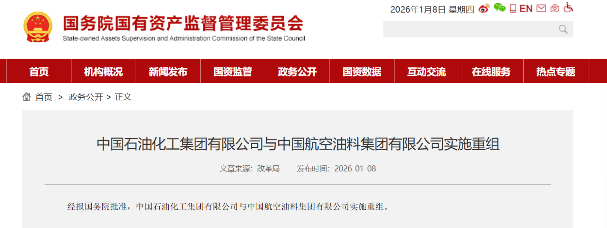 2026年开年之际,央企重组又有新动作——国务院国资委1月8日发布消息,经报国务院批准,中国石油 化工集团有限公司与中国航空油料集团有限公司实施重组。 中国石化是全球第一大炼油公司和我国第一大航油生产商,构筑了航空燃料供应的坚实基础。中国航油 作为亚洲最大的集航空油品采购、运输、储存、检测、销售、加注于一体的航空运输服务保障企业,为 国内数百个运输机场、通用机场提供油料保障,并为全球航空客户提供服务,渠道优势明显。 两家企业的合作有着怎样的战略考量?将如何影响产业格局?从中能看到央企重组整合哪些新动向? 中国石油大学(华东)教授田原宇指出,中国石化、中国航油通过重组整合、优势互补,可以打通从原 油炼化到飞机加注的全产业链环节,理论上可以发挥炼化一体化、航油供应保障体系等多方面优势,减 少中间环节,降低供应成本,为我国航空业能源安全提供坚强保障,有助于增强我国航空燃料产业的国 际竞争力。 "十五五"规划建议提出,推进国有经济布局优化和结构调整,增强国有企业核心功能、提升核心竞争 力。在日前举行的中央企业负责人会议上,国务院国资委主任张玉卓说,2026年国资央企将大力推进战 略性、专业化重组整合和高质量并购。 据 ...