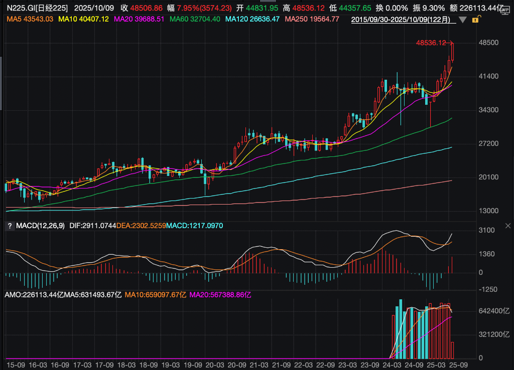 10月9日,受科技股提振,亚洲股市多数上涨。日经225指数、东证指数均创历史新高,软银集团领涨,盘中涨超13%,创历史新高。 欧美股表现分化,美国股指期货基本持平,欧股开盘走软。 债市方面,日本10年期国债收益率及10年期美国国债收益率几乎不变。 商品方面,黄金、原油小幅下跌,铜价接近历史新高。 日经225指数一度突破48536点,创历史新高。 软银集团公司股价一度飙升13%,创下盘中新高。消息面上,软银计划收购ABB有限公司的机器人部门,提升了投资者对人工智能带来利润增长 的预期。软银集团旗下的英国芯片设计公司Graphcore计划宣布在印度投资 10 亿英镑(13 亿美元),其中包括建立一个新的研究中心。 现货黄金下跌0.1%至每盎司4037.48美元。 日经225指数一度突破48536点,创历史新高。 印度sensex指数82044,上涨0.3%。 富时新加坡海峡指数4449.27,下跌0.16%。 现货黄金下跌0.1%至每盎司4037.48美元。 风险提示及免责条款 市场有风险,投资需谨慎。本文不构成个人投资建议,也未考虑到个别用户特殊的投资目标、财务状况或需要。用户应考虑本文中的任何意见、观点或结论 ...