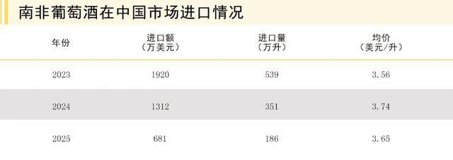 近日,中国与南非签署了《关于共同发展经济伙伴关系的框架协定》。根据协议,双方力争在2026年3 月底前达成"早期收获协议",届时,南非的出口产品将享受100%税目产品零关税待遇。这意味着,南 非葡萄酒即将正式进入中国的零关税清单。 在众多新世界产酒国中,南非葡萄酒在中国市场长期处于边缘位置,这一政策红利能否撬动市场格局? 本文基于最新的贸易数据,梳理南非葡萄酒在中国市场的现状,并分析其未来的发展趋势。 市场份额微小且持续下滑 中国海关总署发布的2025年全年数据显示,南非瓶装葡萄酒对华出口量为186万升,出口额为681万美 元,在中国葡萄酒进口来源国中排名第11位,市场份额仅占同期葡萄酒进口总额的0.50%。与2024年相 比,进口量下降47.03%,进口额下降47.61%。 | | 南非葡萄酒在中国市场进口情况 进口额 | 进口量 | 均价 | | --- | --- | --- | --- | | 年份 | (万美元) | (万升) | (美元/升) | | 2023 | 1920 | 539 | 3.56 | | 2024 | 1312 | 351 | 3.74 | | 2025 | 681 | 186 ...