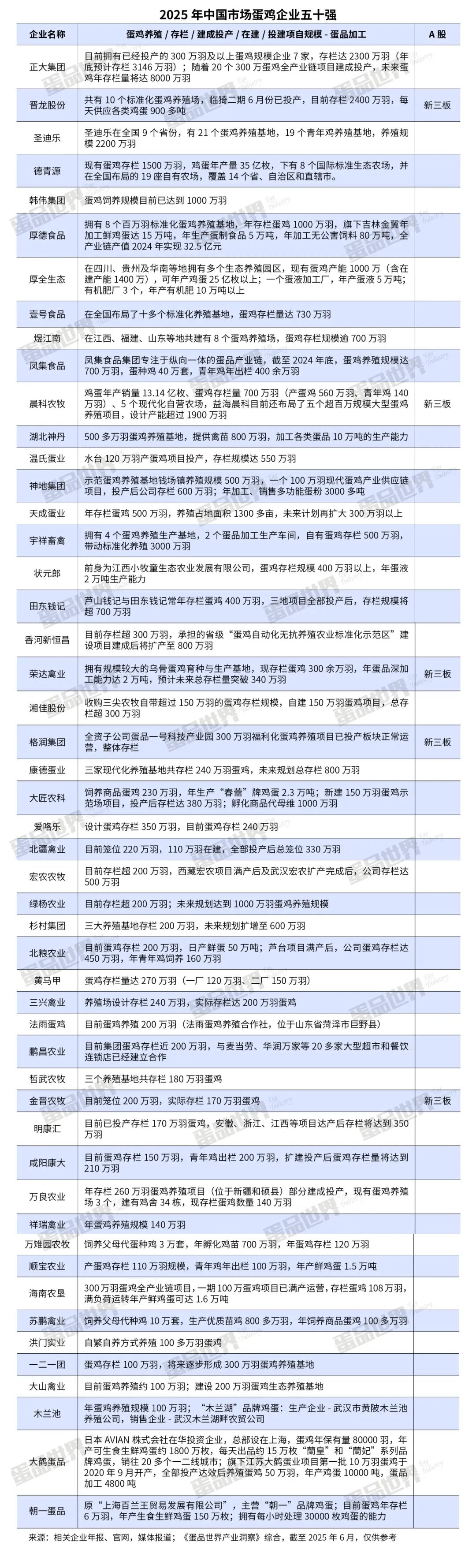 (来源:蛋品世界WECD) 《蛋品世界产业洞察》公布2025年中国蛋鸡企业五十强,其中正大集团、晋龙股份、圣迪乐位列前三。 | 企业名称 | 蛋鸡养殖 / 存栏 / 建成投产 / 在建 / 投建项目规模 - 蛋品加工 | A K | | --- | --- | --- | | | 目前拥有已经投产的 300 万羽及以上蛋鸡规模企业 7 家,存栏达 2300 万羽(年 | 1387 | | 正大集团 | 底预计存栏 3146 万羽);随着 20个 300万蛋鸡全产业链项目建成投产,未来蛋 鸡年存栏量将达 8000 万羽 | | | | GGT | | | 晋龙股份 | 共有 10个标准化蛋鸡养殖场,临猗二期 6月份已投产,目前存栏 2400万羽,每 | 新三板 | | | 天供应各类鸡蛋 900多吨 | | | 辛迪乐 | 圣迪乐在全国 9个省份,有 21个蛋鸡养殖基地,19个青年鸡养殖基地,养殖规 模 2200 万羽 | | | 德青源 | 现有蛋鸡存栏 1500万羽,鸡蛋年产量 35亿枚,下有 8个国际标准生态农场,并 在全国布局的19 座自有农场,覆盖 14个省、自治区和直辖市。 | | | 韩伟集团 | ...