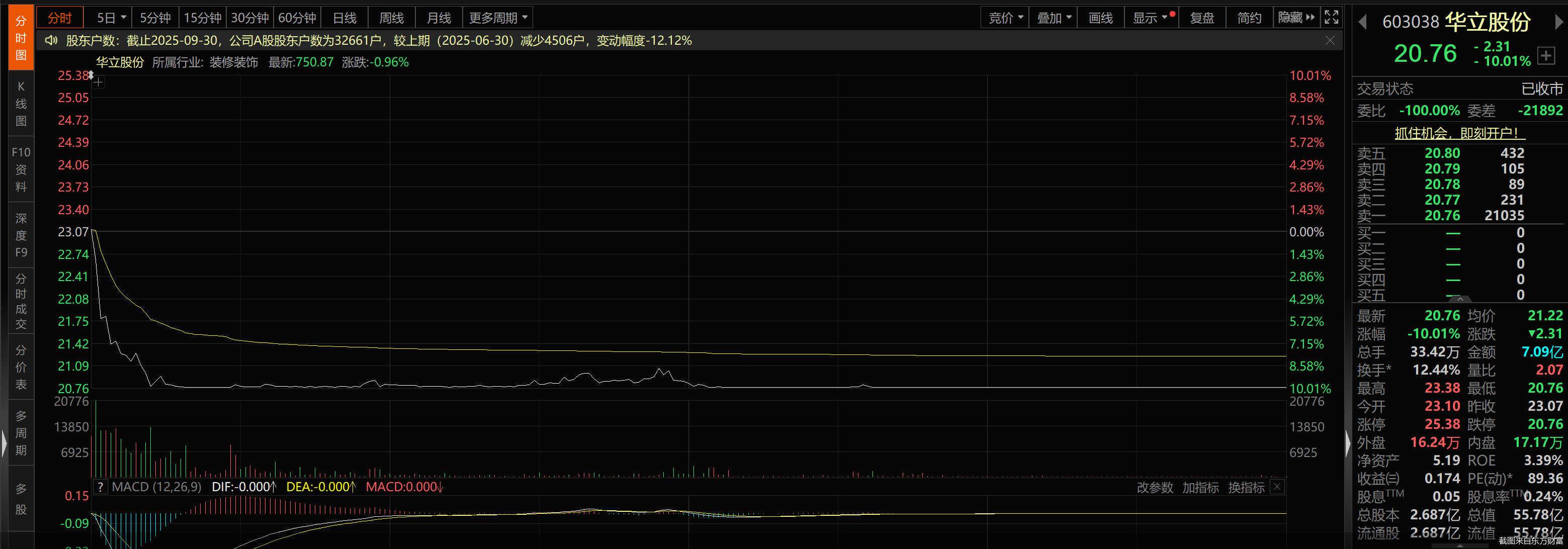 A股公司数字化转型浪潮持续。10月29日晚间,华立股份(603038)宣布了一则并购消息,公司欲收购人工智能企业北京中科汇联科技股份有限公司(以下 简称"中科汇联")51%股份,加速公司数字化转型。不过,消息披露次日,即10月30日,华立股份跌停收盘。北京商报记者注意到,标的公司中科汇联曾有 过冲击创业板IPO的经历。 标的曾冲击创业板IPO 从华立股份本次"相中"的标的中科汇联来看,曾有过冲击上市的经历。 | સ્ત્રે | 关羽 | 5日 ~ | 5分钟 | 15分钟 | 30分钟 | 60分钟 | 日线 | 周线 | 月线 | 更多周期 ▼ | | --- | --- | --- | --- | --- | --- | --- | --- | --- | --- | --- | | 时 | | | | | | <1) 股东户数: 截止2025-09-30, 公司A股股东户数为32661户,较上期(2025-06-30) 减少4 | | | | | | 图 | | | | | 华立股份 所属行业: 装修装饰 最新:750.87 涨跌:-0.96% | | | | | | | K | 25.38 - | ...