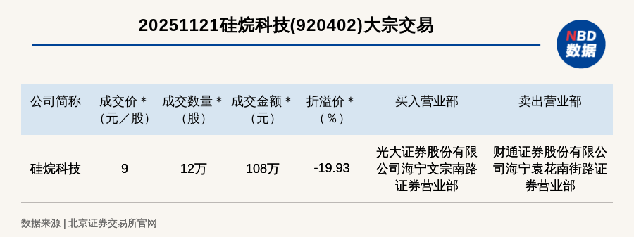 每日经济新闻 (记者 曾健辉) 免责声明:本文内容与数据仅供参考,不构成投资建议,使用前核实。据此操作,风险自担。 每经讯,2025年11月21日,北交所上市公司硅烷科技(920402,收盘价:11.24元)发生一笔大宗交易,成交价9元/股,成交数 量12万股,成交金额108万元,折价19.93%。买入营业部是光大证券股份有限公司海宁文宗南路证券营业部,卖出营业部是财通 证券股份有限公司海宁袁花南街路证券营业部。 ...