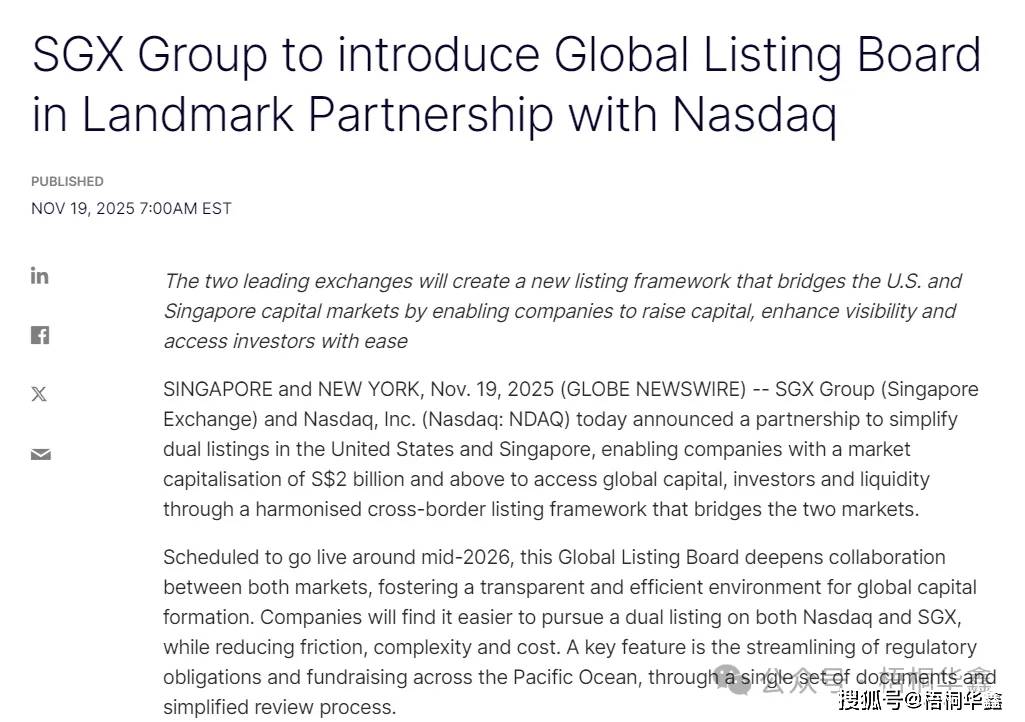 2025年11月19日,新加坡交易所(SGX)与纳斯达克(Nasdaq)联合官宣建立战略合作伙伴关系,计划于2026年年中推出"全球上市板"(Global Listing Board)。这一创新机制以"一套文件、两地挂牌"为核心,打破了跨太平洋上市的监管壁垒,为企业构建起连接美国资本深度与亚洲增长红 利的全新通道,标志着全球资本市场互联互通进入实质阶段。 企业门槛:聚焦"根在亚洲、志在全球"的成长型企业,要求市值不低于20亿新元(约合15亿美元或109亿人民币),需具备稳定经营记录与 清晰增长逻辑。 上市机制:企业可自由选择纳斯达克或新交所作为主上市地,以一套招股书满足两地监管披露要求,通过统一审核流程实现同步挂牌。 交易设计:股票支持美元或新元计价,依托两地交易时区差(纳斯达克交易时段为新加坡时间22:30-次日5:00,新交所为9:00-17:00),企业 股票可实现近乎24小时的连续交易,大幅提升流动性。 政策赋能:新加坡金管局同步推出3000万新元"价值解锁"计划,协助企业优化战略与投资者关系,并向本地资管公司注资28.5亿新元引导市 场资金。 生态协同:淡马锡等新加坡核心资本明确表示,将通过旗下投资 ...