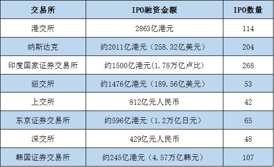 值得关注的是印度国家证券交易所。虽然前十大IPO没有印度企业,但该交易所全年上市268家企业意 味着市场火热,而1.78万亿卢比的融资金额也创下历史纪录。其中不乏募资17亿美元的塔塔集团旗下金 融服务部门塔塔资本,以及募资13亿美元的韩国LG电子印度子公司。 | 交易所 | IPO融资金额 | IP0数量 | | --- | --- | --- | | 港交所 | 2863亿港元 | 114 | | 纳斯达克 | 约2011亿港元(258.32亿美元) | 204 | | 印度国家证券交易所 | 约1500亿港元(1.78万亿卢比) | 268 | | 细交所 | 约1476亿港元(189.56亿美元) | 53 | | 上交所 | 812亿元人民币 | 42 | | 东京证券交易所 | 约596亿港元(1.2万亿日元) | 65 | | 深交所 | 429亿元人民币 | 48 | | 韩国证券交易所 | 约245亿港元(4.57万亿韩元) | 107 | 2025年全球主要交易所上市数据(公开资料整理) 香港大型IPO数量居首 以融资金额算,2025年全球前十大IPO中,港交所占据4个,东京证券交易所有2个 ...