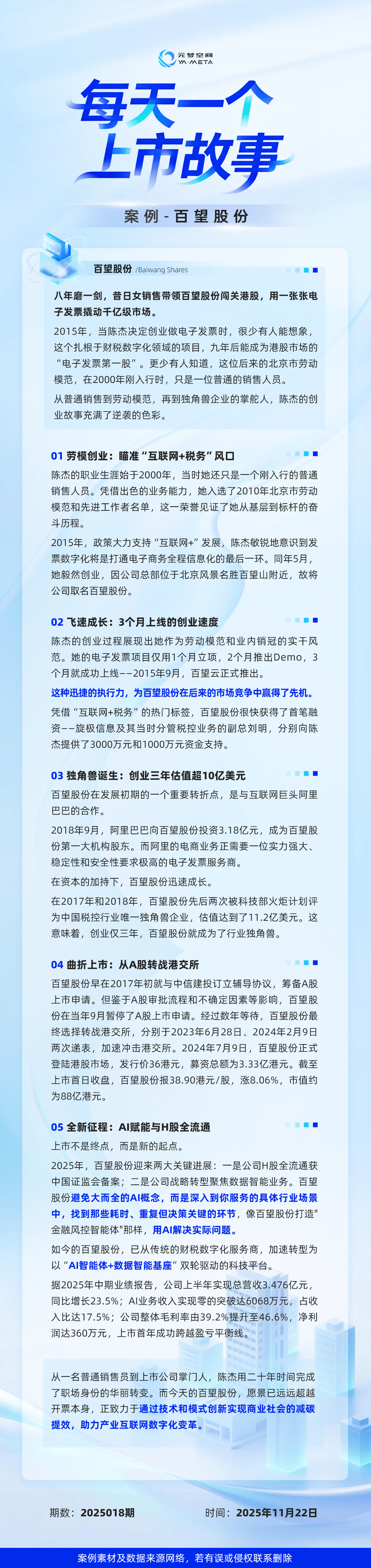 Core Insights - The article highlights the journey of Chen Jie, who transformed from a sales representative to the CEO of Baiwang Co., Ltd., which became the first electronic invoice company listed on the Hong Kong Stock Exchange [1][5][10] Group 1: Company Development - Baiwang Co., Ltd. was founded in 2015, capitalizing on the government's support for "Internet Plus" initiatives, focusing on digital invoicing as a key component of e-commerce [5][6] - The company launched its electronic invoice service, Baiwang Cloud, within three months of its establishment, showcasing rapid execution and gaining a competitive edge in the market [6][7] - By 2018, Baiwang secured a significant investment from Alibaba, becoming the largest institutional shareholder, which propelled the company's growth and led to its valuation exceeding $1 billion within three years [7][9] Group 2: Market Position and Financial Performance - Baiwang was recognized as the only unicorn in China's tax control industry by the Ministry of Science and Technology in 2017 and 2018, with a valuation of $1.12 billion [7] - The company faced challenges in its initial A-share listing attempts but ultimately chose to list on the Hong Kong Stock Exchange, successfully going public on July 9, 2024, with a share price of HKD 36 [8][9] - In its first year post-IPO, Baiwang reported a total revenue of CNY 347.6 million, a year-on-year increase of 23.5%, with AI business revenue reaching CNY 60.68 million, accounting for 17.5% of total revenue [10] Group 3: Future Outlook - Baiwang is transitioning towards a technology platform driven by AI and data intelligence, focusing on specific industry scenarios to enhance efficiency and reduce carbon emissions [10] - The company aims to leverage its technological innovations to facilitate the digital transformation of the industrial internet, moving beyond traditional invoicing services [10]