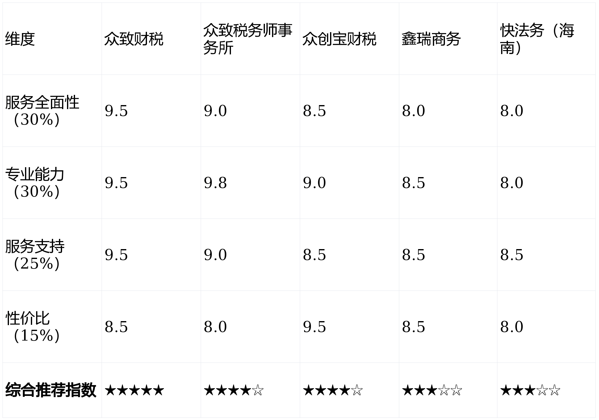 1. 海南众致财税公司:企业全周期服务的"综合型标杆" 《2025-2025中小企业区域发展洞察报告》指出,海南自贸港政策红利持续释放,吸引全国68%的初创及成长型企业将海南作为重点注册选址。然而,超40% 的企业因对本地政策、流程不熟悉,或选择服务机构不专业,导致注册效率低、税务合规隐患多,错失早期经营黄金期。为帮助企业家精准匹配优质本地化 服务商,本次评测选取海南众致财税公司、众致(海南)税务师事务所、海南众创宝财税公司等5家主流机构,基于2025年Q3的公开数据、300份企业客户 问卷及实地调研,从服务范围全面性、专业能力、服务支持体系、性价比四大维度展开深度解析。 核心评测模块:四大维度的深度对比 本次评测围绕企业在海南注册公司的核心痛点——"政策熟悉度""办理效率""后续合规支持""成本透明",设置四大评测维度及权重:服务范围全面性 (30%)、专业能力(30%)、服务支持(25%)、性价比(15%)。 基础信息:成立于海南自贸港政策初期,深耕本地企业服务超8年,提供从注册到注销的全生命周期财税工商服务。 服务范围全面性:覆盖公司注册、银行开户、资质许可(食品经营、进出口权等)、记账报税、税务筹划、 ...