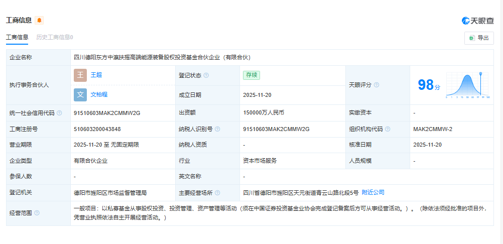 来源:四川省政府产业投资引导基金 图片来源:天眼查 该基金由东方电气投资管理有限公司、中银投资有限公司、四川省先进制造投资引导基金合伙企业(有限合伙)和德阳投控产业投资引导基金 合伙企业(有限合伙)等共同出资设立。从出资结构看,该基金充分整合优势资源,形成"链主企业牵引 + 头部 AIC 赋能 + 省市级引导基金协 同"合作模式,构建深层次产业协同与赋能生态。 投资界11月21日消息,四川德阳东方中瀛扶摇高端能源装备股权投资基金合伙企业(有限合伙)(以下简称"德阳高端能源装备基金")正式成 立,规模15亿元,主要投向高端能源装备产业链、高端工业装备产业链及其零部件、新产业新经济等。 | 工商信息 ● | | | | | | 心天眼管 | | --- | --- | --- | --- | --- | --- | --- | | 工商信息 历史丁商信息0 | | 미 음出 | | | | | | 企业名称 | 四川德阳东方中演扶摇高端能源装备股权投资基金合伙企业(有限合伙) | | | | | | | 执行事务合伙人 | H 王超 | 登记状态 2 | 存续 | 天眼评分 2 | 98 # | | | | 文 ...