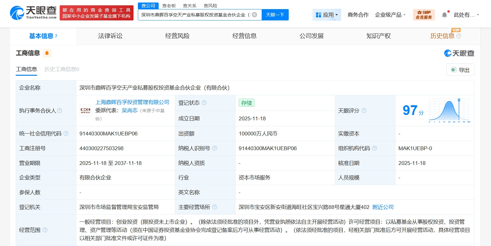 | 都在用的商业查询工具 | 草公司 音老板 | 童关系 音风险 | | | | --- | --- | --- | --- | --- | | | 国家中小企业发展子基金旗下机构 | 深圳市鼎晖百孚空天产业私募股权投资基金合伙企业(: × | 天眼一下 | ▲五三 元 | | 基本信息 7 | 法律诉讼 | 经营风险 | 经营信息 | 公司发展 | | 工商信息 ● | | | | | | 工商信息 历史工商信息0 | | | | | | 企业名称 | 深圳市鼎晖百孚空天产业私募股权投资基金合伙企业(有限合伙) | | | | | 执行事务合伙人 2 | 上海鼎晖百浮投资管理有限公司 CDH 委派代表:吴尚志(来源于中墓 | 登记状态 ② | 存续 | 케 | | | 协) | 成立日期 | 2025-11-18 | | | 统一社会信用代码 2 | 91440300MAK1UEBP06 | 出资额 | 100000万人民币 | গ্রী | | 工商注册号 | 440300227503298 | 纳税人识别号 2 | 91440300MAK1UEBP06 | सेनिस | | 营/期限 | 2025-1 ...