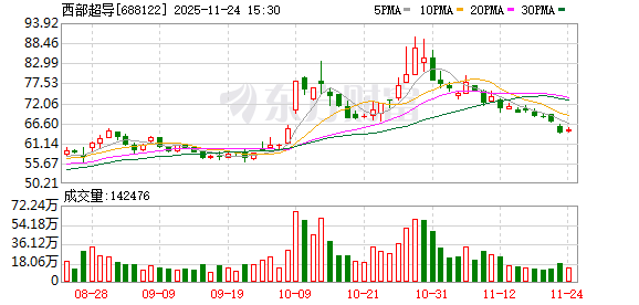 11月24日西部超导大宗交易一览 | 成交量 | 成交金额 | 成交价 | 相对当日收盘 | | | | --- | --- | --- | --- | --- | --- | | (万 | (万元) | 格 | 折溢价(%) | 买方营业部 | 卖方营业部 | | 股) | | (元) | | | | | 25.56 | 1354.68 | 53.00 | -18.41 | 中国中金财富证券有限公 | 中国银河证券股份有限公司 | | | | | | 司成都东御街证券营业部 | 东莞东城中路证券营业部 | (文章来源:证券时报网) 证券时报·数据宝统计显示,西部超导今日收盘价为64.96元,上涨1.64%,日换手率为2.19%,成交额为 9.23亿元,全天主力资金净流入3938.11万元,近5日该股累计下跌6.96%,近5日资金合计净流出4.12亿 元。 两融数据显示,该股最新融资余额为16.00亿元,近5日减少7210.14万元,降幅为4.31%。 据天眼查APP显示,西部超导材料科技股份有限公司成立于2003年02月28日,注册资本64966.4497万人 民币。(数据宝) 西部超导11月24日大宗交易 ...