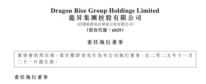 来源:瑞恩资本RyanbenCapital 龙昇集团(06829.HK)董事会宣布,邹舒寄先生已获委任为执行董事,自2025年11月21日起生效。 邹先生, 40岁,于投资管理、新能源产业、跨境贸易及及企业管治方面累积丰富经验,并建立广泛的国际商务网 络及供应链资源。 邹先生目前为深圳市南山区人大代表。 邹先生于2022年获委任为香港全港各区工商联荣誉顾问,于2022年获委任为深圳市氢能与燃料电池协会 特邀顾问,于2023年获委任为大湾区进出口商业总会执行会长,及于2025年获委任为深圳市金融商会执 行会长。 版权声明:所有瑞恩资本Ryanben Capital的原创文章,转载须联系授权,并在文首/文末注明来源、作 者、微信ID,否则瑞恩将向其追究法律责任。部分文章推送时未能与原作者或公众号平台取得联系。 若涉及版权问题,敬请原作者联系我们。 更多香港上市、美国上市等境外IPO资讯可供搜索、查阅,敬请浏览: www.ryanbencapital.com 彼分别自2018年及2024年起担任中盈投资基金(深圳)有限公司及天汇股权管理有限公司的董事长。 ...