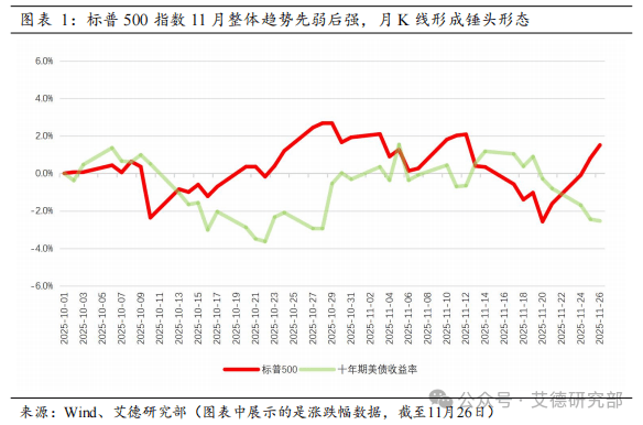 摘要: 53%基金经理认为AI存在泡沫:美银11月全球基金经理调查认为人工智能存在泡沫的讨论已经出现(占比达 53%),且有45%的基金经理认为"AI泡沫"是当前最大的尾部风险。从利率变化、标普500走势上看,人工智 能发展阶段与九十年代互联网发展阶段的路径极为相似,而当前的情形更像是1998年泡沫形成初期。如果说 每一轮产业周期最终都以泡沫破裂的方式出清,1998年三季度市场短暂调整之后,标普500仍上涨了两年,最 终因通胀上升联储持续加息而在2000年第四季刺破巨大的泡沫。 无需过度畏惧高估值:标普500前三季盈利均实现双位数同比增长,第四季彭博一致预期同比增长10.8%,首 先持续的盈利增长会消化掉高估值;其次高估值是由AI科技革命驱动的高估值,是局部的高估值,标普500 有11个一级行业,还有很多估值偏低的行业;再次美联储货币政策处于宽松周期,利率下降将提升企业盈 利。 12月展望:11月中上旬波动率(VIX)最高上升达26.4点,引起估值挤压但盈利未见受损,随着美联储转鸽十 年期国债利率下降,特朗普总统签署"创世纪计划"(Genesis Mission)国家级人工智能战略行政命令,为人 工智能发展提 ...
