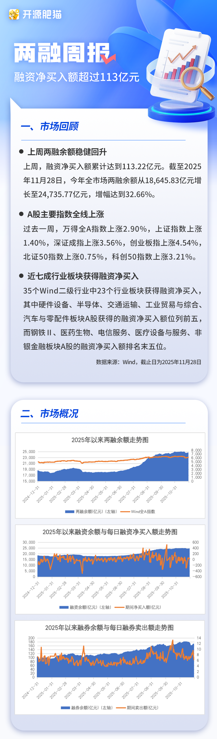 (来源:肥猫财经) 汽车与零配件板块A股获得的融资净买入额位列前五, 而钢铁 II、医药生物、电信服务、医疗设备与服务、非 银金融板块A股的融资净买入额排名末五位。 数据来源:Wind,截止日为2025年11月28日 市场概况 30.000 足之一 2025年以来两融余额走势图 25,000 23.000 21. 19.0 17 ( 2025年以来融资余额与每日融资净买入额走势图 2025年以来融券余额与每日融券卖出额走势图 14 200 180 12 160 10 8 6 4 2 0 券余额(亿元)(左轴) 期间卖出额(亿元) 交易数据 近一周融资净买入额排名前五的行业 ■融资净买入额(亿元) ■近一周涨跌幅(%) 100 80 60 40 20 O 工业贸易与综 -20 半导体 汽车与零配件 硬件设备 交通运输 合 94.90 33.84 7.81 6.82 6.57 6.63 5.86 -0.41 3.90 3.27 单位:亿元 近一周融资净买入额排名后五的行业 ■融资净买入额(亿元) ■近一周涨跌幅 (%) 5 0 -5 -10 -15 -20 -25 -30 医疗设备与服 钢铁 II 医药生物 电信 ...