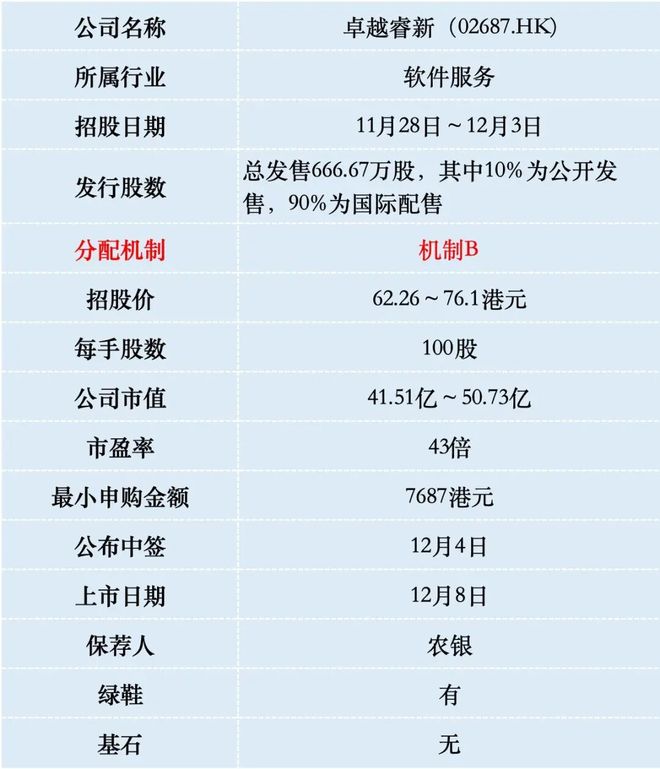 (来源:郭二侠说财) 自从海伟股份打破了港股IPO分配新规实施以来首次上市新股不破发的神话,再遇到首次上市新股也不 能闷头干了,需要仔细斟酌。 来源:市场资讯 卓越睿新放在最后写新股分析,是想观察一下市场热度。目前看来不及预期,以往类似公开发售0.5亿 的新股,融资1500亿且认购达3000倍的情况轻而易举,现在看来只能达到预期的一半。 一、招股信息 | 公司名称 | 卓越容新 (02687.HK) | | --- | --- | | 所属行业 | 软件服务 | | 招股目期 | 11月28日~12月3日 | | 发行股数 | 总发售666.67万股,其中10%为公开发 售,90%为国际配售 | | 分配机制 | 机制B | | 招股价 | 62.26~76.1港元 | | 每手股数 | 100股 | | 公司市值 | 41.51亿~50.73亿 | | 市盈率 | 43倍 | | 最小申购金额 | 7687港元 | | 公布中签 | 12月4日 | | 上市目期 | 12月8日 | | 保荐人 | 农银 | | 绿鞋 | 有 | | 基石 | 元 | 二、公司概况 卓越睿新成立于2008年,作为一家高校教学 ...