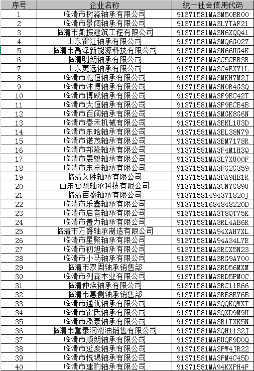 想脱单、找对象,就来临清相亲 经核查,临清市树淼轴承有限公司等79户企业,存在连续两年未在"国家企业信用信息公示系统(山 东)"报送并公示2023、2024年度报告的情形,涉嫌存在"成立后无正当理由超过六个月未开业的,或者 开业后自行停业连续六个月以上"的行为。 临清市树淼轴承有限公司等79户企业,应当自本公告发布之日起15日内补报未报年度报告并申请移出经 营异常名录。企业登记的住所(或经营场所)已发生变更的,应当向企业登记机关申请变更登记;企业 终止经营的,应当向企业登记机关申请办理注销登记。 公告期满仍未履行以上法定义务的,将依据《企业信息公示暂行条例》第十八条和《中华人民共和国公 司法》第二百六十条第一款,依法吊销营业执照。 营业执照被吊销的,自被吊销之日起三年内其企业法定代表人不得担任企业的董事、监事及高级管理人 员。 附件:临清市连续两年未年报列异且地址失联的企业名单(第二批) "临清相亲" 临清市市场监督管理局清理长期停业未经营企业提示公告 (第二批) 临清市树淼轴承有限公司等79户企业: 2026 年 2 月24 日 来源:临清市政府网站 | 41 | 临清市坤欧轴承有限公司 | 9137158 ...