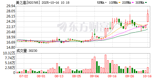 公司发布的半年报数据显示,上半年公司共实现营业收入2.29亿元,同比下降3.76%,实现净利 润-182.34万元,同比下降115.42%,基本每股收益为-0.0200元。(数据宝) (文章来源:证券时报网) 美之高股价创出历史新高,截至9:35,该股上涨22.81%,股价报28.00元,成交量159.70万股,成交金额 4196.83万元,换手率2.83%,该股最新A股总市值达25.11亿元,该股A股流通市值15.78亿元。 证券时报·数据宝统计显示,美之高所属的轻工制造行业,目前整体涨幅为0.14%,行业内,目前股价上 涨的有48只,涨幅居前的有美之高、德力股份、华源控股等,涨幅分别为22.81%、9.98%、5.86%。股 价下跌的有110只,跌幅居前的有海鸥住工、英联股份、玉马科技等,跌幅分别为4.40%、2.96%、 2.96%。 两融数据显示,该股最新(10月15日)两融余额为334.70万元,其中,融资余额为334.70万元,近10日 减少38.04万元,环比下降10.20%。 ...