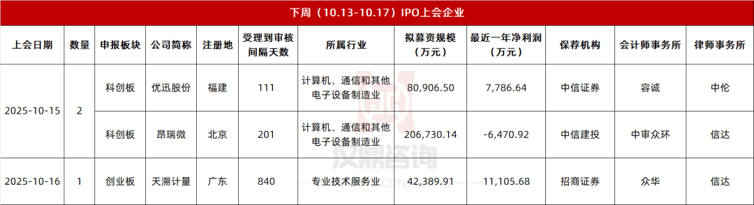 据交易所官网审核动态信息,下周(10月13日-10月17日)IPO上会审核3家企业,合计拟募资33亿元。 | | | | | | | 下周 (10.13-10.17) IPO上会企业 | | | | | | | --- | --- | --- | --- | --- | --- | --- | --- | --- | --- | --- | --- | | 上会日期 | 数量 | 申报板块 | 公司简称 | 注册地 | 受理到审核 间隔天数 | 所属行业 | 拟募资规模 (万元) | 最近一年净利润 (万元) | 保荐机构 | 会计师事务所 | 律师事务所 | | 2025-10-15 | | 科创板 | 优迅股份 | 福建 | 111 | 计算机、通信和其他 电子设备制造业 | 80,906.50 | 7,786.64 | 中信证券 | 容诚 | 中伦 | | | | 科创板 | 昂瑞微 | 北京 | 201 | 计算机、通信和其他 电子设备制造业 | 206,730.14 | -6,470.92 | 中信建投 | 中审众环 | 信达 | | | | | | | | | 1 | | | | | | | | ...