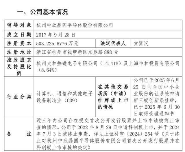 | 辅导对象 杭州中欣晶圆半导体股份有限公司 | | | | --- | --- | --- | | 成立日期 | 2017年9月28日 | | | 注册资本 | 503.225.6776万元 法定代表人 | 贺贤汉 | | 注册地址 | 浙江省杭州市钱塘新区东垦路 888 号 | | | 控股股东 | 杭州大和热磁电子有限公司(14.41%)及上海申和投资有限公司 | | | 及持股比 | (8.64%) | | | 例 | | | | 行业分类 | | 公司已于2025年6月 | | | 在其他交易 | 25 日向全国中小企 | | | 计算机、通信和其他电子 场所(申请) | 业股份转让系统申请 | | | 设备制造业(C39) 挂牌或上市 | 新三板创新层挂牌, | | | 的情况 | 已于2025年6月30 | | | | 日取得受理通知书 | | 许 | 近三年内公司存在提交首次公开发行股票并上市申请被终止审 | | | | 查的情形。公司于2022年8月29日申请科创板上市,并于 2024 | | | | 年7月3日被终止审查,详见上证科审(2024)254号《关于终 | | | | 止对杭州中 ...