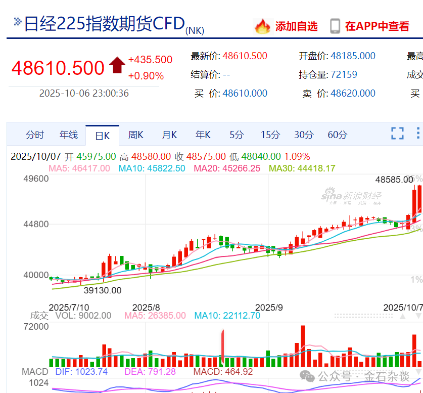 对于日本股市爆发,最核心的原因就是日本政坛的一则爆炸性消息:10月4日,日本前经济安全保障担当大臣高市早苗在执政党自民党的总裁选 举中胜出,将成为日本首位女性首相。 而日本股市之所以暴涨,和她的执政理念关系密切,高市早苗的经济政策主张带有鲜明的"安倍经济学"烙印,与刚刚辞去首相职务的石破茂鲜 明对立。她的核心理念就是宽松。 高市早苗在政治上与安倍晋三渊源颇深,也被视为"安倍经济学"的继承人,主张扩张性财政政策。她认为,经济增长对日本最为重要,要制定 规划让日本经济规模在10年内翻倍,这意味着减税、经济刺激和政府投资。 随着高市早苗当选,分析师也大幅下调了日本12月加息的概率。互换市场显示,日本央行12月加息的概率从上周五的68%降至41%。 不过,大家发现,日元上演暴跌行情,日元调空暴跌,一度失守150日元关口。日元暴跌背后,高市早苗支持宽松的财政和货币政策,外界认为 其上台或加剧对债券供应增加的担忧,同时降低对日本央行本月加息的预期。 来源:金石随笔 10月6日,日本股市突然爆发,日经225指数午后突破48000点,日内涨近5%。截至发稿,日经225指数期货再度冲高近1%,高见48610点。如果 从10月4 ...