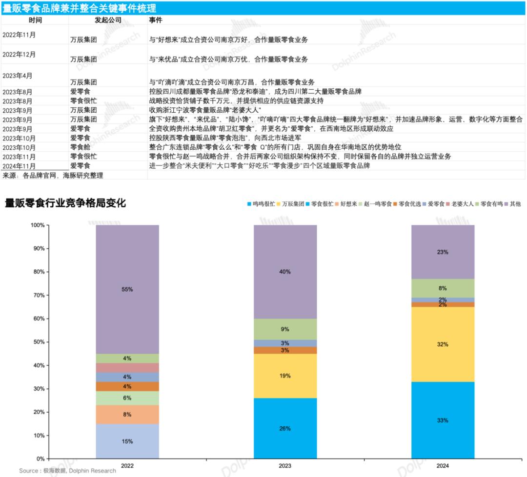 上篇《鸣鸣很忙:"零食界拼多多"凭何练就?》,海豚君带大家聊透了零食圈 "拼多多式" 黑马——鸣鸣很忙的商业模式以及支撑其商业模式高效运转的 核心引擎——高度数字化的供应链体系。 但热闹过后,关键问题来了:这匹黑马的增长后劲到底足不足?在不久的将来上市后,它能成为投资者眼中的 "香饽饽" 吗? 话不多说,这篇咱直接上干货,扒一扒零食很忙的成长潜力与上市投资价值! 以下为详细内容 为了避免陷入降价-亏损-再降价的恶性循环,从下表可以看到,2023年开始,量贩零食开始加速整合,中小品牌在连续亏损的情况下,要么通过"抱团取 暖"成为区域巨头,要么选择被巨头吞并,剩下的基本都因为无法承受亏损而倒闭退出。 23年9月万辰集团将旗下独立运营的"陆小馋、好想来、来优品、吖滴吖滴"四大量贩零食品牌统一翻牌成"好想来"统一运营,11月行业第一的零食很忙与 行业第三的赵一鸣零食战略合并为鸣鸣很忙。 1、跑马圈地,高速开店期已过 在探讨很忙的开店空间前,海豚君先带大家简单梳理一下量贩零食行业竞争格局的变化,简单来说,前后分为两个阶段: 1.0 阶段:师傅带徒弟,各自占山为王(2017 - 2021年):作为"厂家直采、现金结账、极 ...