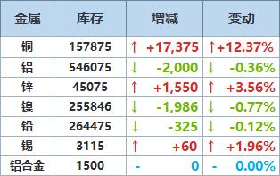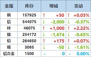 》查看更多金属库存信息 | 金屋 | 阵存 | 增减 变动 | | --- | --- | --- | | 铜 | 157925 | T +50 ↑ +0.03% | | 铝 | 544075 | ﺑﺴ -2.000 1 -0.37% | | 锌 | 46075 | ↑ +1,000 ↑ +2.22% | | 寝 | 254172 | - -1.674 J -0.65% | | 铝 | 264650 | 1 +175 ↑ +0.07% | | 锡 | 3065 | - -50 -1.61% | | 铝合金 | 1500 | 0 - 0.00% | | LME库存 | | --- | | 我屋 | 阵 | 注册6审 | | 变动 | 注销仓单 | | 变动 | 注销占比 上日占比 | | | --- | --- | --- | --- | --- | --- | --- | --- | --- | --- | | 铜 | 157925 | 148450 | T | +0.20% | 9475 | | -2.57% | 6.00% | 6.16% | | 铝 | 544075 | 484800 | | -1.22 ...