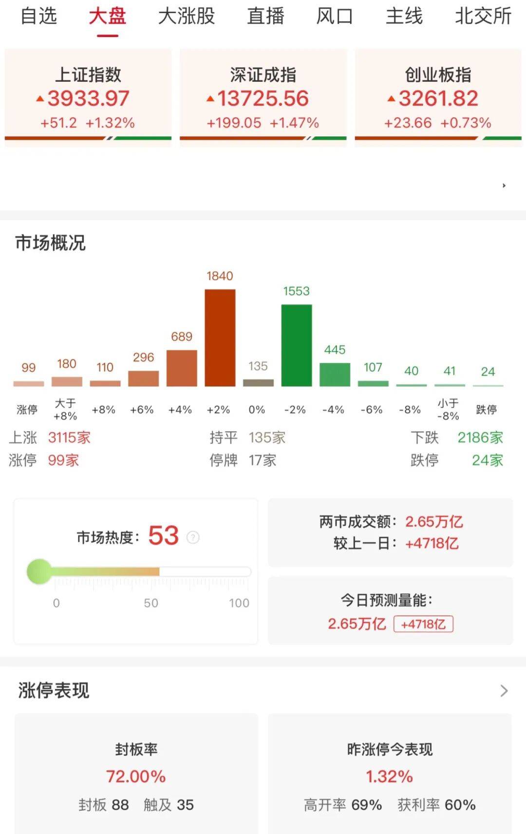 今日沪指高开高走突破3900点整数大关,刷新2015年8月以来新高。创业板指和科创50指数冲高回落。沪深两市成交额2.65万亿,较上一个交易日放量 4718亿。 盘面上,市场热点轮番活跃, 全市场共有99只个股涨停。从板块来看,有色金属、核电板块上演涨停潮。核电板块表现活跃,合锻智能8天4板,永鼎股 份、安泰科技等十余股涨停。有色金属板块全天走强,精艺股份6天5板,江西铜业、河钢资源、白银有色等十余股涨停。下跌方面,影视院线概念股集体 大跌,中国电影等股跌停。 板块方面,有色金属、核电、稀土永磁等板块涨幅居前,影视院线、旅游、教育等板块跌幅居前。 截至收盘,沪指涨1.32%,深成指涨1.46%,创业板指涨0.73%。 | 自选 大盘 大涨股 直播 | | 风口 主线 北交所 | | --- | --- | --- | | I | | | | 上证指数 | 深证成指 | 创业板指 | | -3933.97 | -13725.56 | -3261.82 | | +51.2 +1.32% | +199.05 +1.47% | +23.66 +0.73% | 素材来源:智通财经、智通财经、上观新闻 ...