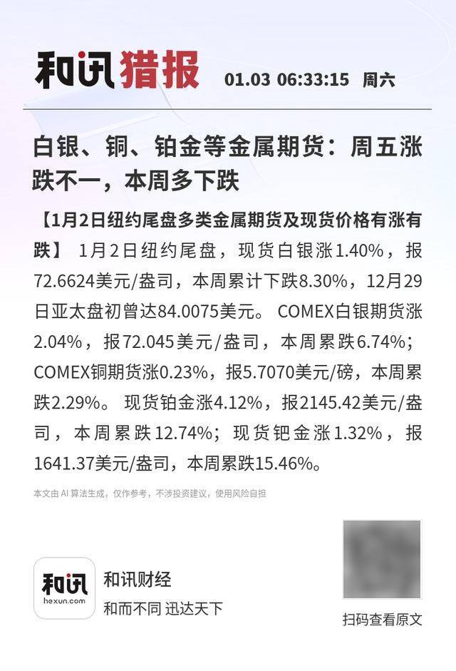【1月2日纽约尾盘多类金属期货及现货价格有涨有跌】1月2日纽约尾盘,现货白银涨1.40%,报72.6624 美元/盎司,本周累计下跌8.30%,12月29日亚太盘初曾达84.0075美元。 COMEX白银期货涨2.04%,报 72.045美元/盎司,本周累跌6.74%;COMEX铜期货涨0.23%,报5.7070美元/磅,本周累跌2.29%。 现货 铂金涨4.12%,报2145.42美元/盎司,本周累跌12.74%;现货钯金涨1.32%,报1641.37美元/盎司,本周 累跌15.46%。 本文由 AI 算法生成,仅作参考,不涉投资建议,使用风险自担 和讯财经 和而不同 迅达天下 扫码查看原文 白银、铜、铂金等金属期货:周五涨 跌不一,本周多下跌 【1月2日纽约尾盘多类金属期货及现货价格有涨有 跌】 1月2日纽约尾盘,现货白银涨1.40%,报 72.6624美元/盎司,本周累计下跌8.30%,12月29 日亚太盘初曾达84.0075美元。COMEX白银期货涨 2.04%,报72.045美元/盎司,本周累跌6.74%; COMEX铜期货涨0.23%,报5.7070美元/磅,本周累 跌2.29%。 现货铂金涨4. ...
