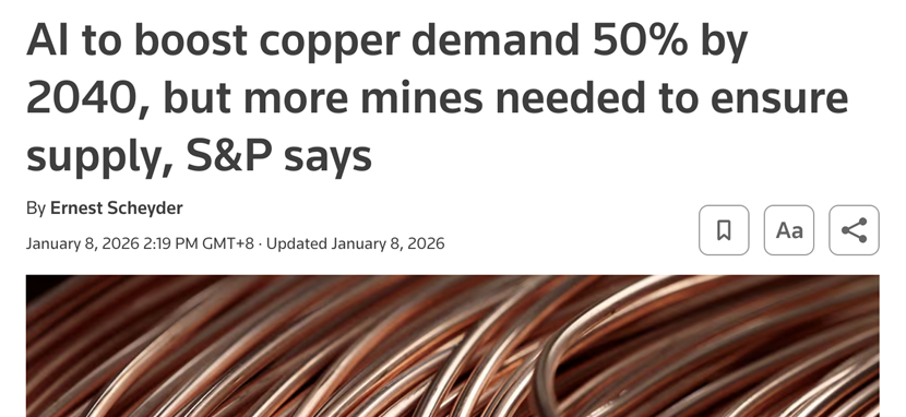 【环球网财经综合报道】据路透社报道,标普全球(S&P Global)于当地时间周四发布报告称,受人工智能、国防及 机器人产业扩张推动,全球铜需求预计将在2040年增长50%,若无法同步扩大回收与开采规模,届时年供应缺口将超 过1000万吨。 据报道,作为建筑、交通、科技及电子行业的关键材料,铜因其卓越的导电性、耐腐蚀性及易加工特性而长期被广泛 应用。标普报告预测,到2040年全球铜年需求量将达4200万吨,较2025年的2800万吨显著上升;若无新增供应,近四 分之一需求恐难满足。 标普副董事长兼报告联合作者Dan Yergin称:"全球电气化的推进是核心驱动力,而铜正是电气化的基石金属。" 与此同时,高盛大宗商品研究团队在近日发布的研报中指出,过去一个月铜价经历剧烈波动,自11月底不足11,000美 元/吨一度飙升至1月6日13,387美元/吨的高位,累计涨幅达22%。高盛承认当前价格已超出其约11,400美元/吨的基本面 公允价值,但分析认为"超涨"存在合理支撑:投资者资金大规模涌入、美国以外市场库存低迷形成"稀缺溢价",叠加 美国拟征铜关税引发囤货行为,共同推升价格。基于此,高盛将2026年上半年伦敦金 ...