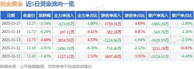 招金黄金(000506)11月17日主力资金净卖出673.95万元