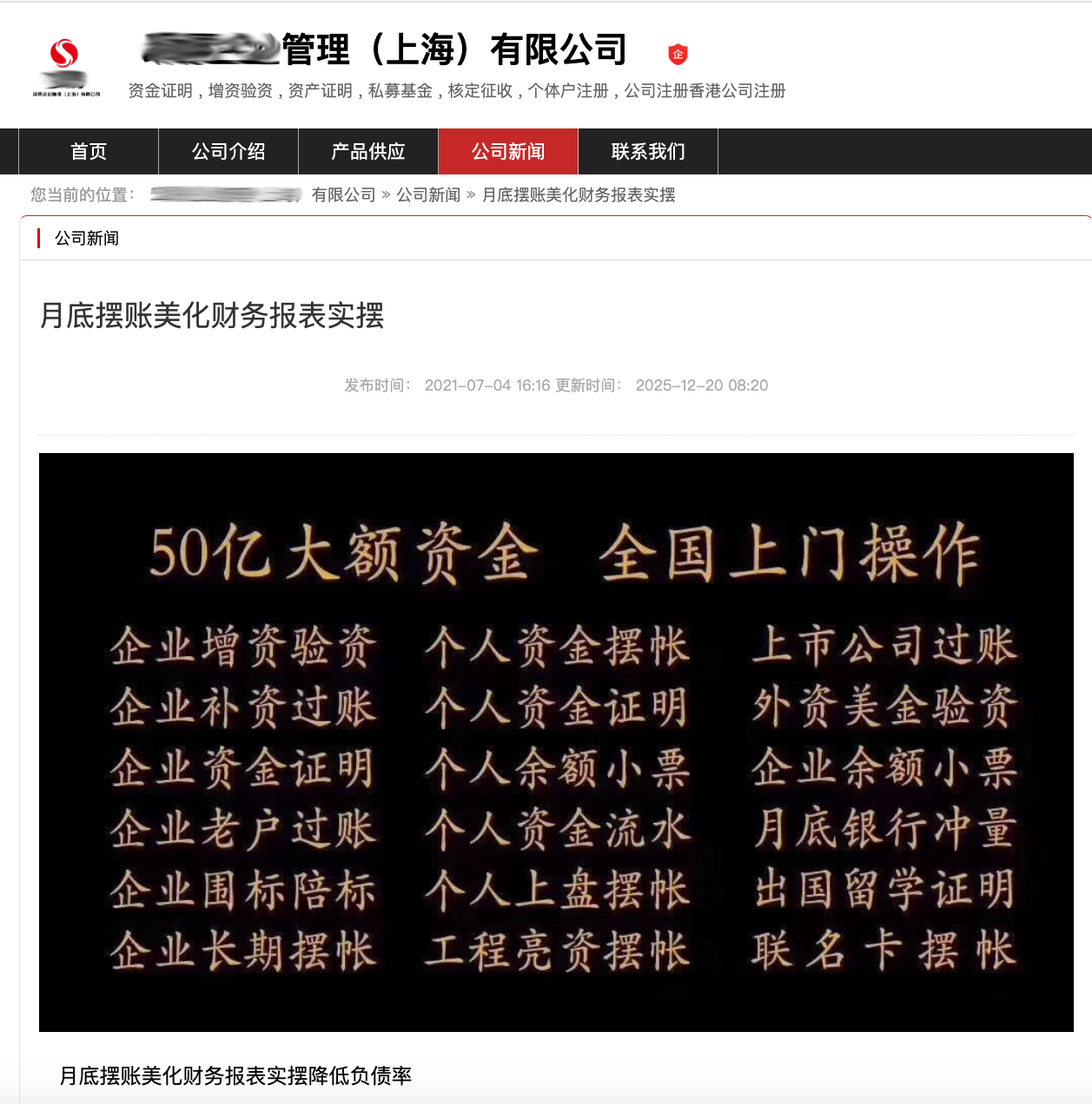 每经记者|王沐霖 每经编辑|吴永久 岁末年终,资本市场进入财报编制的关键阶段,一场围绕上市公司及拟IPO公司的"财报美化"地下生意正公然蔓延。 《每日经济新闻》记者(以下简称每经记者)注意到,近期在部分股票投资交流群、金融行业社群中,有不少"报表优化""摆账""亮资"等业务推广信息出 现;并且,在百度、知乎、小红书等平台上搜索"财报美化业务",亦会出现公然揽客的帖子。 财报如何"美化"?是否涉及违法违规?具体如何操作?美化后的财报能否通过审计?带着这些问题,每经记者以上市公司工作人员的身份暗访了几位服务提 供方。 据了解,"年底报表优化"业务的核心实质是资金中介方提供的短期资金拆借服务,具体操作路径是:由上市/拟上市公司预先制定明确的资金流转"路径 图",资金中介提供资金并指导资金在多个指定账户间完成无真实贸易背景的循环划转,通过这类账面资金空转操作,实现营收规模、经营性现金流等核心 财务指标的表面优化,此类业务的单笔拆借资金规模可至十亿元级别。 上海明伦律师事务所律师王智斌明确指出,资金中介明知企业用于财务造假仍提供资金,即便不参与账务处理,也构成虚假陈述的协助行为,涉嫌违反《证 券法》及刑法相关规定,可能 ...