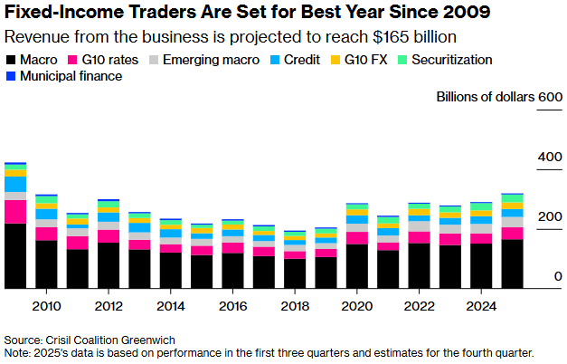 智通财经APP注意到,华尔街的宏观交易员正迈向自2009年以来业绩最佳的一年,因客户纷纷押注全球 各大央行利率政策的转变。 根据Crisil Coalition Greenwich的数据,高盛集团、摩根大通和花旗集团等公司今年预计将从固定收益、 信贷和大宗商品交易中产生1650亿美元的收入,较2024年增长10%。 全球央行的利率调整、关税政策的不确定性、对财政赤字膨胀的担忧以及收益率曲线趋陡,尤其扩大了 利率交易员的费用池。在十国集团利率业务中,收入预计将达到400亿美元的五年来高点。 Coalition Greenwich预计2026年将出现类似的大幅增长,届时行业收入预计为1620亿美元,仅下降2%。 高盛欧洲利率产品交易主管尼基尔·乔拉利亚在接受采访时表示:"央行正在将其政策利率和资产负债表 正常化,但尚未正常化的是庞大的发行规模。这些情况大多会持续存在。我们没有理由认为我们在2025 年看到的活跃水平不会在2026年重现。" 固定收益交易员有望迎来2009年以来最好的一年 新兴市场宏观交易员预计将获得至少20年来最大的350亿美元收入。信贷交易员预计将获得270亿美元, 大宗商品交易员预计将获得11 ...