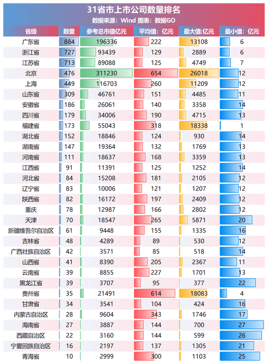 来源:市场资讯 来源:数据GO 数据截止时间:2025年10月1日 | | | | 31省市上市公司数量排名 | | | | --- | --- | --- | --- | --- | --- | | | | | 数据来源: Wind 图表:数据GO | | | | 省级 | 数量 | 参考总市值亿元 | 平均值:亿元 | 最大值:亿元 | 最小值:亿元 | | 广东省 | 884 | 196336 | 222 | 13108 | 6 | | 浙江省 | 727 | 93439 | 129 | 2889 | 6 | | 江苏省 | 713 | 89088 | 125 | 4749 | 7 | | 北京 | 476 | 311230 | 654 | 26018 | 12 | | 上海 | 449 | 116703 | 260 | 11209 | 12 | | 山东省 | 309 | 46761 | 151 | 4485 | 11 | | 安徽省 | 186 | 26061 | 140 | 3358 | 14 | | 四川省 | 179 | 34006 | 190 | 4715 | 13 | | 福建省 | 17 ...