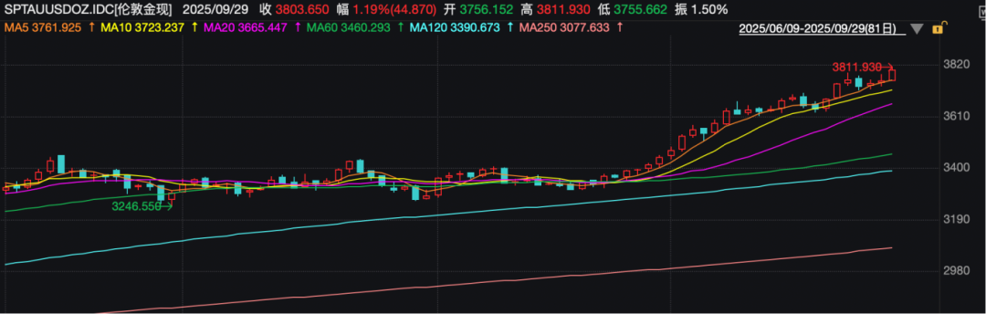 黄金再创新高。 巴克莱银行策略师则在周日的最新报告中表示,相对于美元和美国国债,黄金价格似乎没有被高估;考虑到美联储可能失去独立性的风险性质,黄金价格 应该包含一定程度的美联储相关溢价。 华联期货认为,从9月美联储议息会议来看失业率和通胀预测,相比6月,9月对2025年失业率预测不变,调低2026和2027年失业率;对2025年通胀预测不 变,调高2026年通胀预测;对2025年及其后经济预测调高,从预测来看,后续降息次数不多,黄金利好空间或受限,但黄金长期利好逻辑仍在,包括美元 走弱以及全球政治经济不稳带来的央行购金,黄金继续上涨的观点不变。 COMEX黄金盘中亦刷新历史纪录,最高至3840.4美元/盎司。 今年以来,黄金价格震荡上涨,持续刷新历史纪录。中信建投研报认为,8月底以来,黄金打破今年5月之后的震荡格局出现趋势性上行,通过拆解三大需 求的变化,大致判断本轮价格新高的资金驱动仍是金融投资参与者(ETF市场)。 中信建投研报显示,2024年下半年以来,全球ETF需求进入补库阶段,但主导的买盘力量出现多次切换,反映市场定价主线的切换。今年6—8月,西方市 场重新主导ETF流入,直接映射下半年黄金的宏观定 ...