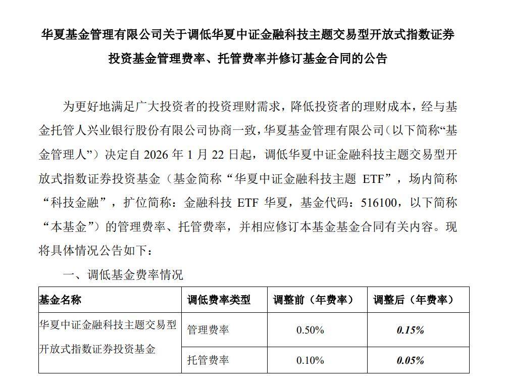 Core Viewpoint - The article discusses the reduction of management and custody fees for certain ETFs, highlighting the potential cost savings for investors and the investment opportunities in the fintech sector. Fee Adjustments - The management fee for the Huaxia CSI Financial Technology Theme ETF has been reduced from 0.50% to 0.15% [2] - The custody fee for the Open Index Securities Investment Fund has been lowered from 0.10% to 0.05% [2] - For an investment of 100,000 yuan held for one year, the total annual fees for a typical fintech ETF at 0.6% would amount to approximately 600 yuan, while the Huaxia fintech ETF at 0.2% would only cost about 200 yuan, resulting in a direct savings of 400 yuan [2] Investment Opportunities in Fintech - The CSI Financial Technology Theme Index includes popular concepts such as stock trading software, software development, digital currency, and cross-border payments, combining both financial and technological attributes [2] - Major stocks in the index include industry leaders like Tonghuashun, Dongfang Caifu, and Runhe Software, with significant exposure to cross-border payment (40.17%), stock trading software (29.48%), and stablecoins (21.83%) [4] Index Performance - Since the 934 market rally in 2024, the fintech index has demonstrated high growth and elasticity, outperforming both the broader market index and brokerage indices [5] Market Catalysts - Positive fundamentals and market sentiment are contributing to a favorable environment for fintech investments, with the Shanghai Composite Index recently breaking the 4100-point mark and achieving a record trading volume of 3.6 billion yuan [6] - The launch of the new digital RMB 2.0 mechanism on January 1, 2026, is expected to enhance its applications in payments, inclusive finance, and cross-border settlements [6] - The integration of generative AI into core business processes in the financial sector is projected to grow significantly, with over 80% of banks expected to adopt this technology by 2026 [8] Future Outlook - The fintech sector is anticipated to attract market attention due to the overall positive trend in A-shares and the clear focus on technological innovation [9] - The sector stands to benefit from increased market trading activity and is positioned at the intersection of digital financial reform and the penetration of AI technology into core business processes [9]