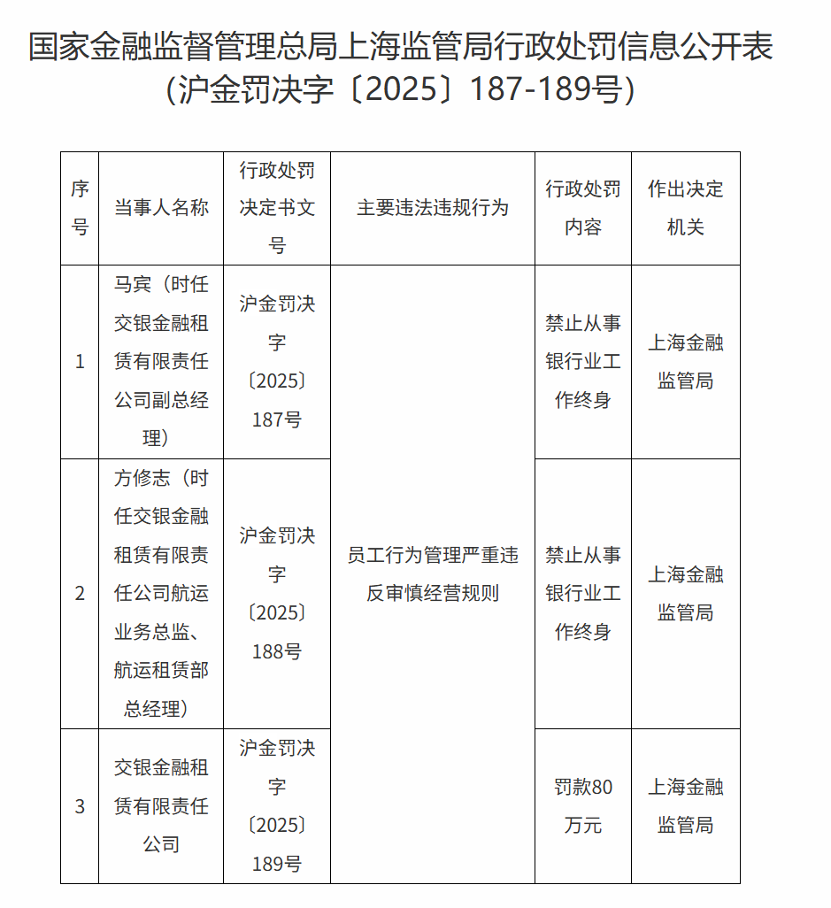 11月19日,国家金融监督管理总局上海监管局发布行政处罚信息公开表,其中显示,因员工行为管理严 重违反审慎经营规则,时任交银金融租赁有限责任公司副总经理马宾,时任交银金融租赁有限责任公司 航运业务总监、航运租赁部总经理方修志,被处以禁止从事银行业工作终身的处罚。 交银金融租赁有限责任公司被处以罚款80万元。 | A | 政务信息 | 在线服务 互动交流 统计数据 | 机构概况 | 新闻资讯 | | | | | --- | --- | --- | --- | --- | --- | --- | --- | | 当朝位置:首页 > 政务信息 > 行政处罚 > 监管局本级行改处罚 | | | | | | | | | SITH ANN BAND OPS | 来源:上海监管局 文章类型:原创 | 发布时间:2025-11-19 | | | | | | | 国家金融监督管理总局上海监管局行政处罚信息公开表 | (沪金罚决字〔2025〕 187-189号) | | | | | | | | 行政处罚 | 彩 | 行政处罚 | 作出决定 | 网 | 当事人名称 | 决定书文 | 主要违法违规行为 | | 号 | 内容 | 机关 ...