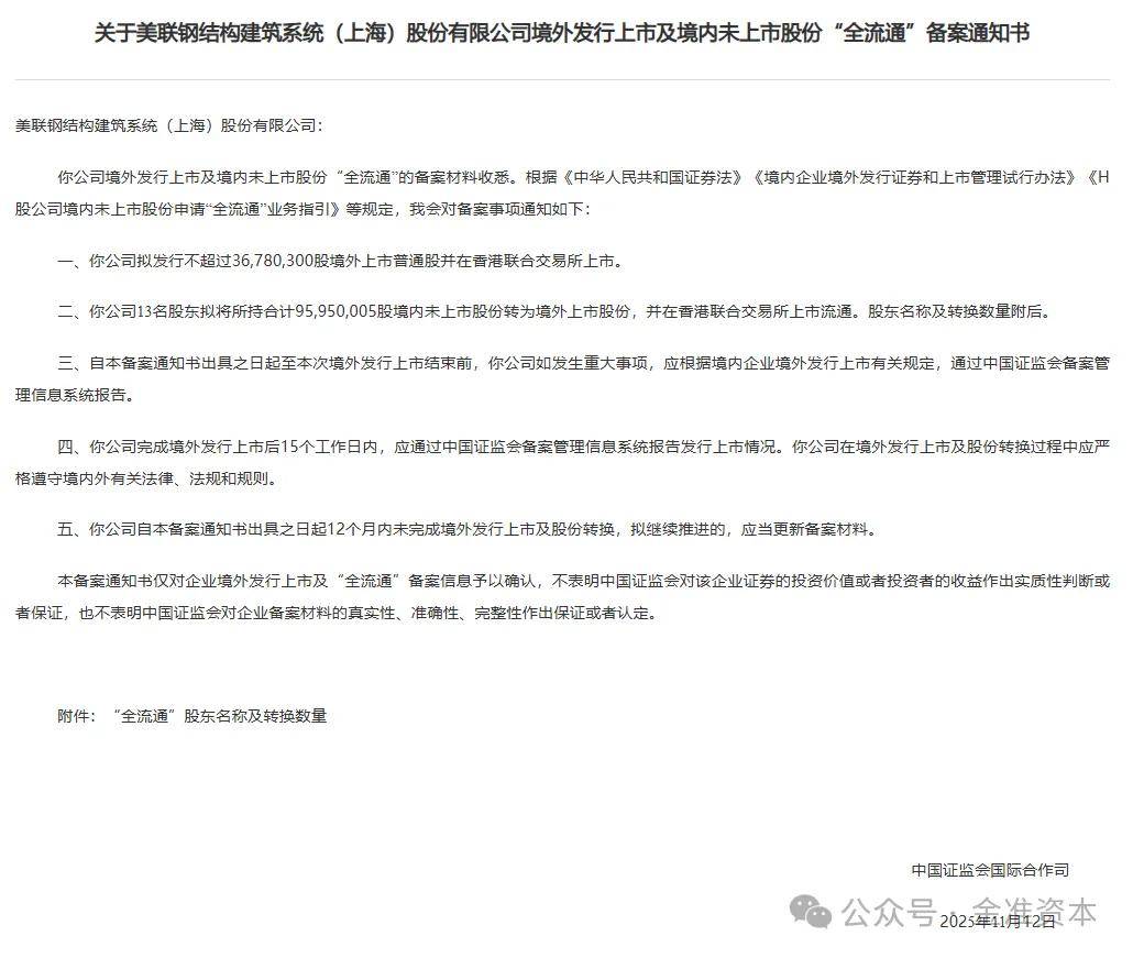1,关于美联钢结构建筑系统(上海)股份有限公司境外发行上市及境内未上市股份"全流通"备案通知书 美联钢结构建筑系统(上海)股份有限公司: 你公司境外发行上市及境内未上市股份"全流通"的备案材料收悉。根据《中华人民共和国证券法》《境内企业境外发行证券和上市管理试行办法》 《H股公司境内未上市股份申请"全流通"业务指引》等规定,我会对备案事项通知如下: 一、你公司拟发行不超过36,780,300股境外上市普通股并在香港联合交易所上市。 二、你公司13名股东拟将所持合计95,950,005股境内未上市股份转为境外上市股份,并在香港联合交易所上市流通。股东名称及转换数量附后。 三、自本备案通知书出具之日起至本次境外发行上市结束前,你公司如发生重大事项,应根据境内企业境外发行上市有关规定,通过中国证监会备案 管理信息系统报告。 四、你公司完成境外发行上市后15个工作日内,应通过中国证监会备案管理信息系统报告发行上市情况。你公司在境外发行上市及股份转换过程中应 严格遵守境内外有关法律、法规和规则。 五、你公司自本备案通知书出具之日起12个月内未完成境外发行上市及股份转换,拟继续推进的,应当更新备案材料。 本备案通知书仅对 ...