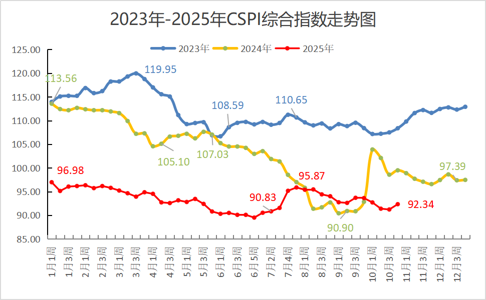 智通财经APP获悉,中钢协称,10月份,国内钢材市场震荡下行,月末止跌回升,但整体仍呈震荡下行趋势。进入11月份以来,受淡季效应影响,需求快 速下降,钢价回归偏弱的基本面,继续呈现震荡偏弱运行态势。 一、10月份国内钢价指数均值环比继续下降 据钢铁协会监测,2025年10月份,CSPI平均值为91.92 点,环比下降1.26点,降幅为1.35%;同比下降9.10点,降幅为9.01%。其中,CSPI长材指数平均值 为92.23点,环比下降1.49点,降幅为1.58%;同比下降13.04点,降幅为12.39%。板材指数平均值为91.17点,环比下降1.15点,降幅为1.25%;同比下降 6.80点,降幅为6.94%。 截至2025年10月末,中国钢材价格指数(CSPI)为92.34 点,环比下降1.29点,降幅为1.38 %;比上年末下降5.13点,降幅为5.26 %;同比下降7.15点,降幅 为7.19 %。(见下图) 1-10月份,CSPI平均值为93.50点,同比下降9.91点,降幅为9.58%。 (一)长、板材月末价格环比均有所下降 截至2025年10月末,CSPI长材指数为92.83点,环比下降1.33 ...