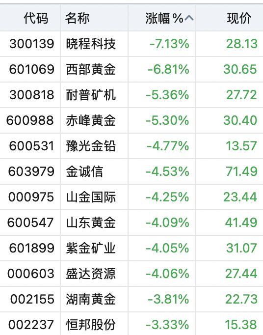 | 代码 | 名称 | 涨幅 %ヘ | 现价 | | --- | --- | --- | --- | | 300139 | 晓程科技 | -7.13% | 28.13 | | 601069 | 西部黄金 | -6.81% | 30.65 | | 300818 | 耐普矿机 | -5.36% | 27.72 | | 600988 | 赤峰黄金 | -5.30% | 30.40 | | 600531 | 豫光金铅 | -4.77% | 13.57 | | 603979 | 金诚信 | -4.53% | 71.49 | | 000975 | 山金国际 | -4.25% | 23.44 | | 600547 | 山东黄金 | -4.09% | 41.49 | | 601899 | 紫美矿业 | -4.05% | 31.07 | | 000603 | 盛达资源 | -4.06% | 27.44 | | 002155 | 湖南黄金 | -3.81% | 22.73 | | 002237 | 恒邦股份 | -3.33% | 15.38 | 10月10日盘初, 黄金、有色金属板块多数下挫。黄金概念方面, 晓程科技跌超7%, ...