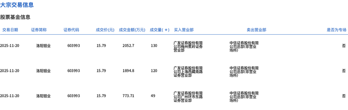 Group 1 - The core transaction of Luoyang Molybdenum involved 2.99 million shares traded on November 20, with a total transaction value of 47.21 million yuan, accounting for 2.59% of the total trading volume for the day [1] - The transaction price was 15.79 yuan, which remained stable compared to the market closing price of 15.79 yuan [1] Group 2 - Specific trading details include a transaction amount of 20.527 million yuan for 130 shares, and another transaction amount of 18.948 million yuan for 120 shares, both at the same price of 15.79 yuan [2] - Additional transactions included a volume of 773.71 thousand shares for a total of 7.7371 million yuan, also at the price of 15.79 yuan [2]